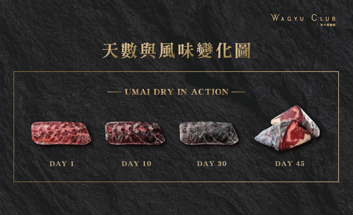 - 30-45 天:香氣更強烈、肉香味集中,牛肉的鮮味到達高峰,適合喜歡濃郁風味的饕客。