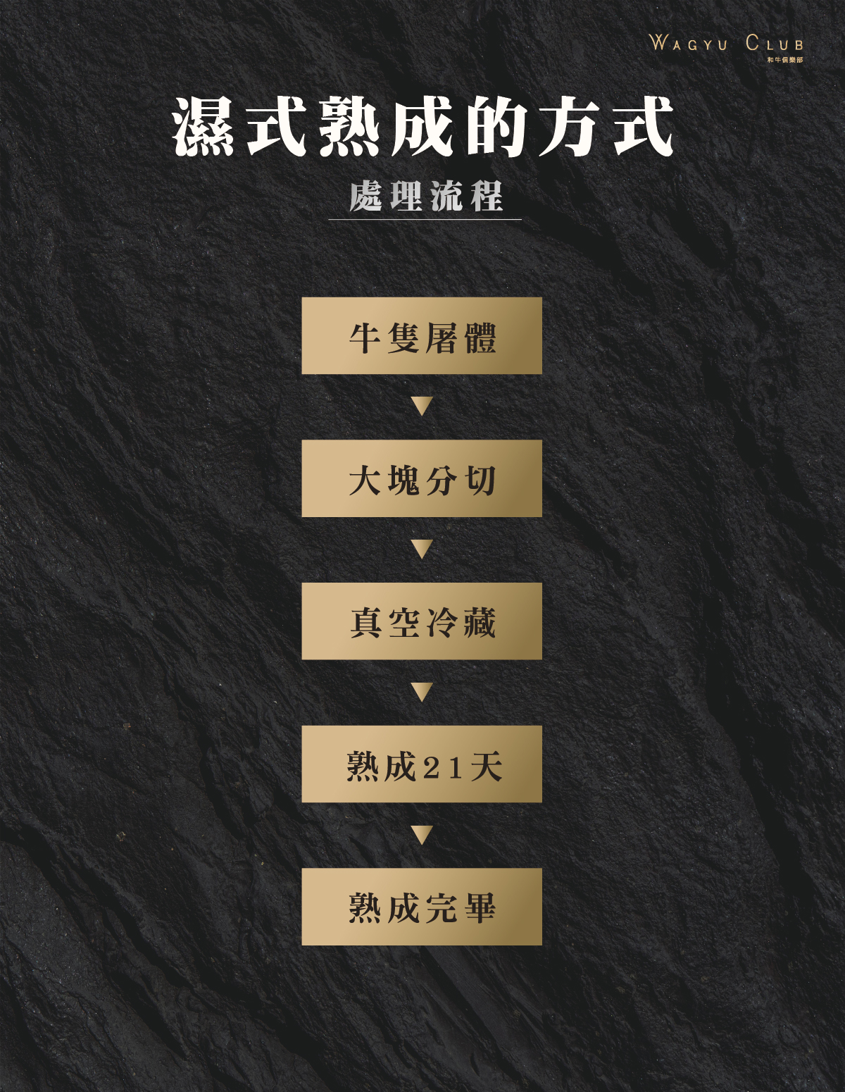 - 濕式熟成:將牛肉的原汁與風味完整封存於真空袋內,讓牛肉透過自身的汁液熟成嫩化,能夠吃到牛肉原始的風味與鮮甜。