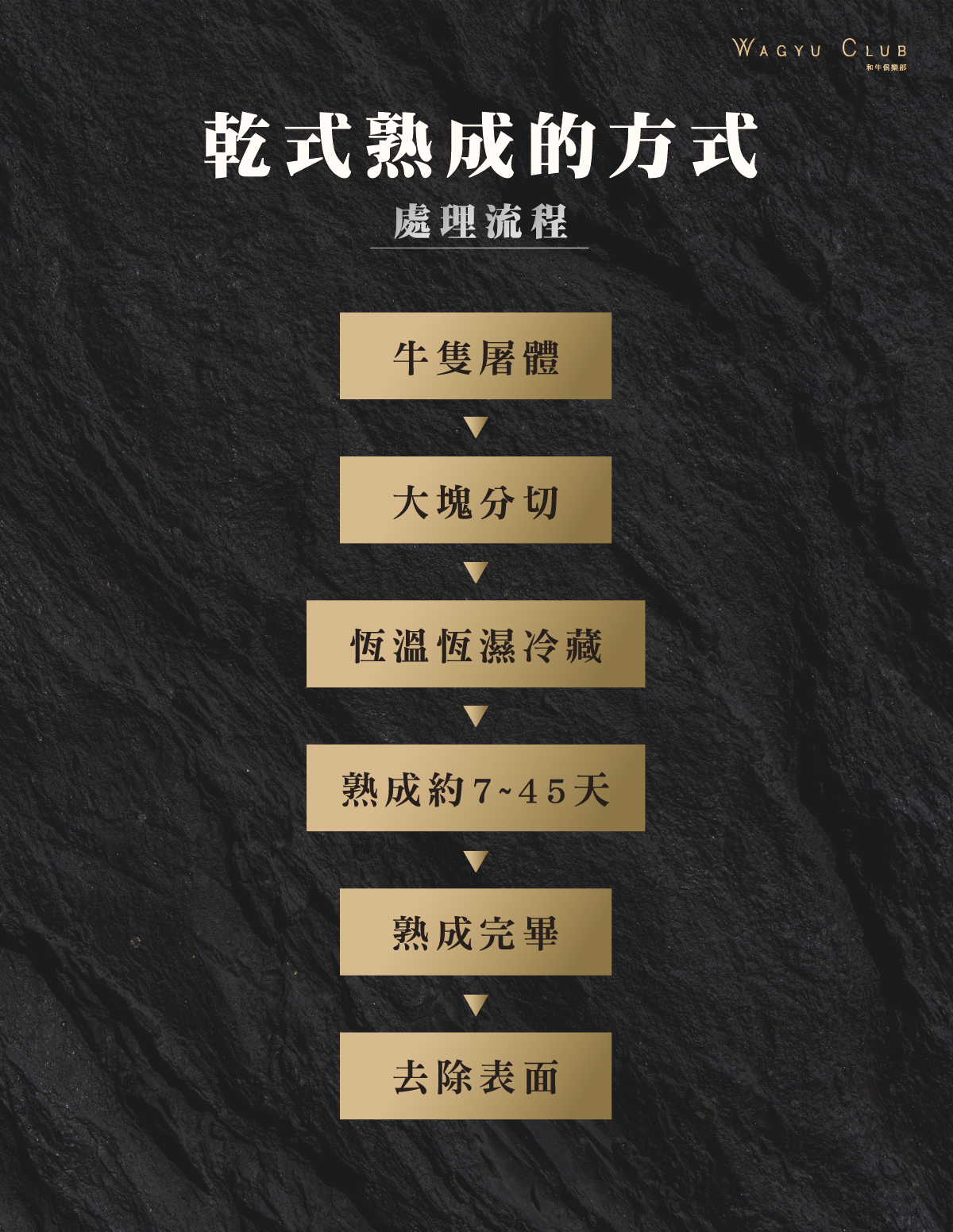 乾式熟成是將牛肉外層的皮脂和水分蒸發與風乾,讓牛肉表面形成硬殼,保護內部肉質的新鮮,同時讓風味因水分蒸發而更加集中。乾式熟成的具體作法,是在牛隻被屠宰後,將牛肉在未經過包裝的情況下,放置於 0-3°C 左右的熟成室內,並將濕度控制在 75% 至 85% 之間,確保室內的空氣流動穩定,熟成約 20-45 天。在熟成過程中,牛肉會透過自身的酵素將蛋白質與脂肪,分解成帶有鮮味與香氣的胺基酸和脂肪酸,最後脂肪接觸空氣氧化後,會讓牛肉產生堅果或奶油的香氣。