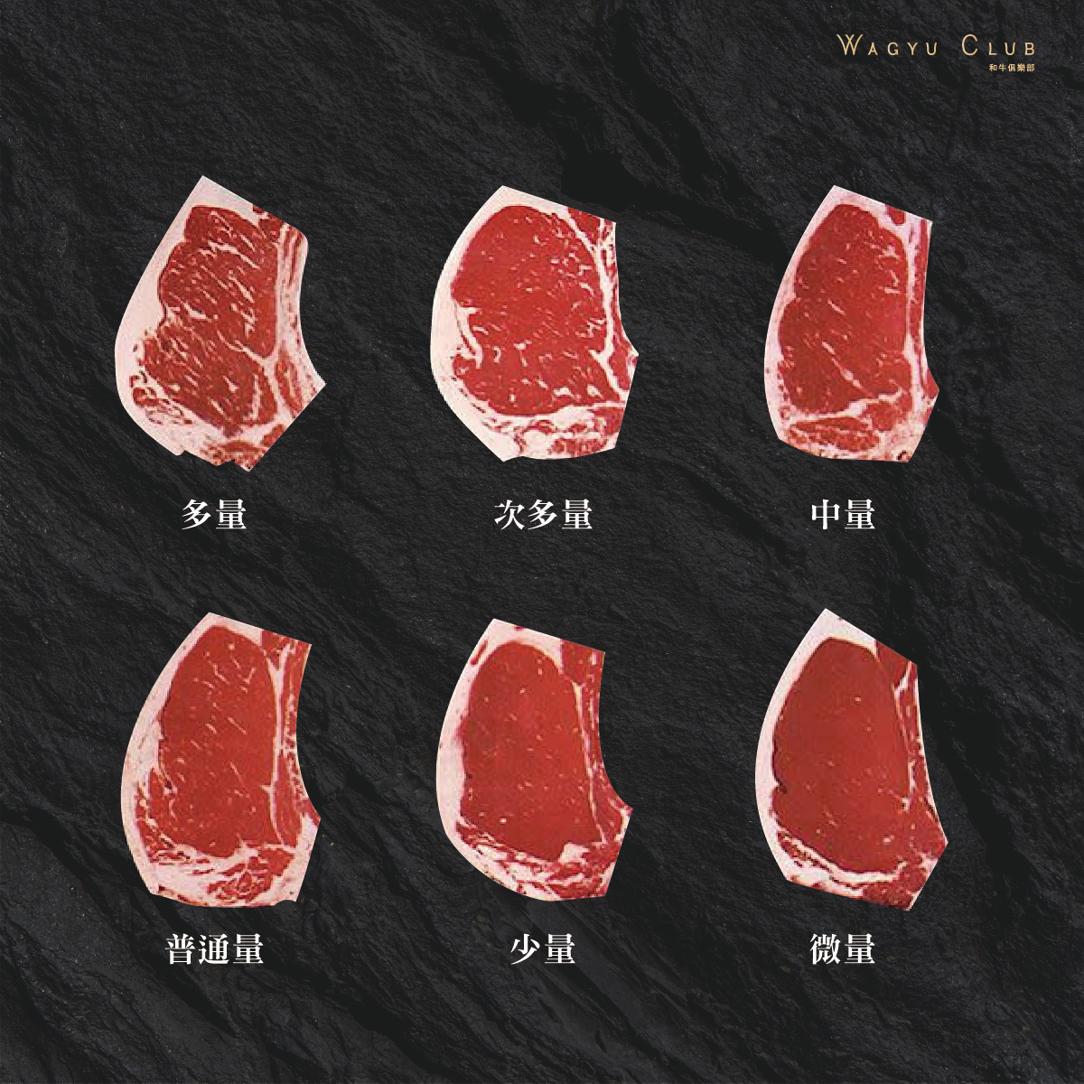 在評估大理石脂肪含量的時候,會觀察牛隻第 12 與第 13 根肋骨之間,肋眼肌切面的瘦肉中所分布的脂肪紋理與數量評斷,並將其細分為 10 個等級,其中 10 級脂肪含量最低,而 1 級脂肪含量最高。